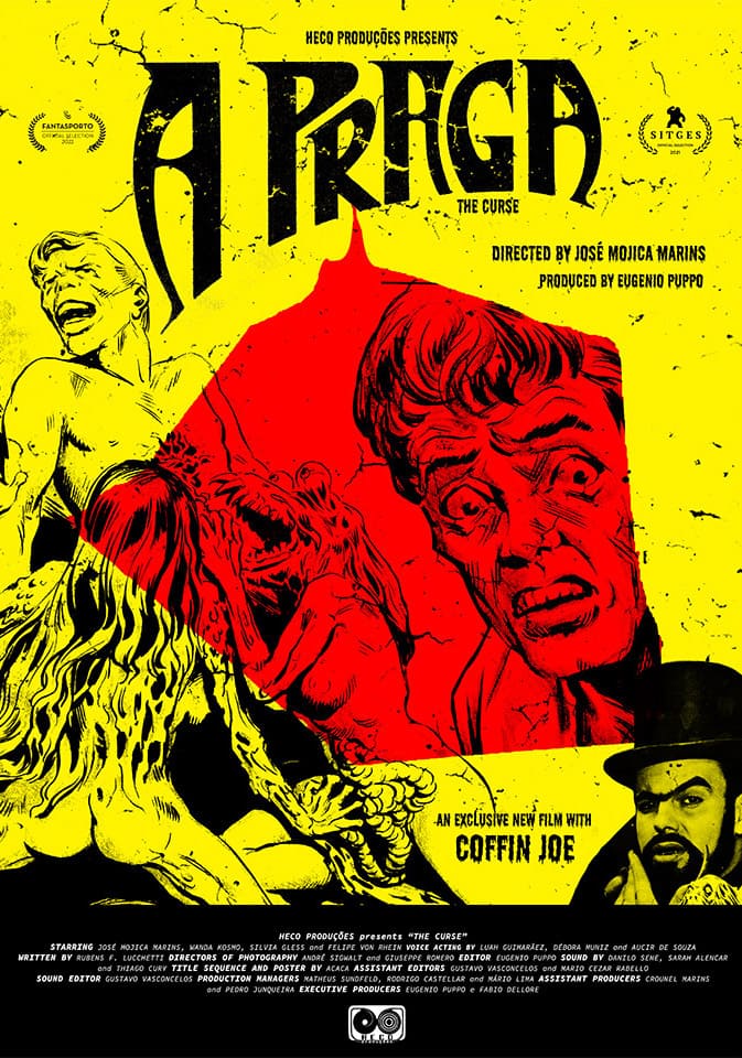 La maldición a la que refiere el título de la película no está exclusivamente en su interior. También la realización y finalización de A praga pareció por mucho tiempo sometida a una vieja condena de una bruja sin rostro. Una primera versión de la película se perdió en un incendio. Mojica Marins la filmó otra vez. Nunca se pudo terminar del todo y los rollos se perdieron. El productor Eugenio Puppo encuentra luego las imágenes. Para hacer vivir a ese cuerpo despedazado que fue A praga se necesitó, entre otras cosas, una nueva pista de sonido. Todo ese proceso de alquimia cinematográfica levantó lo que hoy podemos ver. La rutina doméstica de una pareja de jóvenes amantes salta al vacío después de que una bruja le lanza una maldición a Juvenal, un fotógrafo ruidoso (me parece un gran gesto la combinación que da la película entre el merecer la ruina por ser un fotógrafo ocioso y el poner a circular la maldición como una especie de revancha generacional) y blasfemo que no cree en el poder de lo sobrenatural. Como se sabe, eso es lo peor que puede pasar en el universo escatológico de Mojica: no saber cómo administrar el terror a lo desconocido, a lo que apenas se deja ver en la negrura de la noche, atrae la desgracia. Semejante a la desvinculación que existe entre los cuerpos y sus voces, en la película todo está desdoblado, también como Juvenal tiene el riesgo de que todo el interior salga de su cuerpo. Comentada por el propio Marins en la piel de su personaje icónico Ze do Caixao (relato sobre relato), la película tiene todas las combinaciones posibles sobre la violencia, el canibalismo y el despedazamiento de cuerpos. Hay una boca viva que se traga todo. De manera paradójica, la película convierte a Juvenal en una serpiente para sostener una evidencia: del cuerpo solo son duraderos los huesos.
