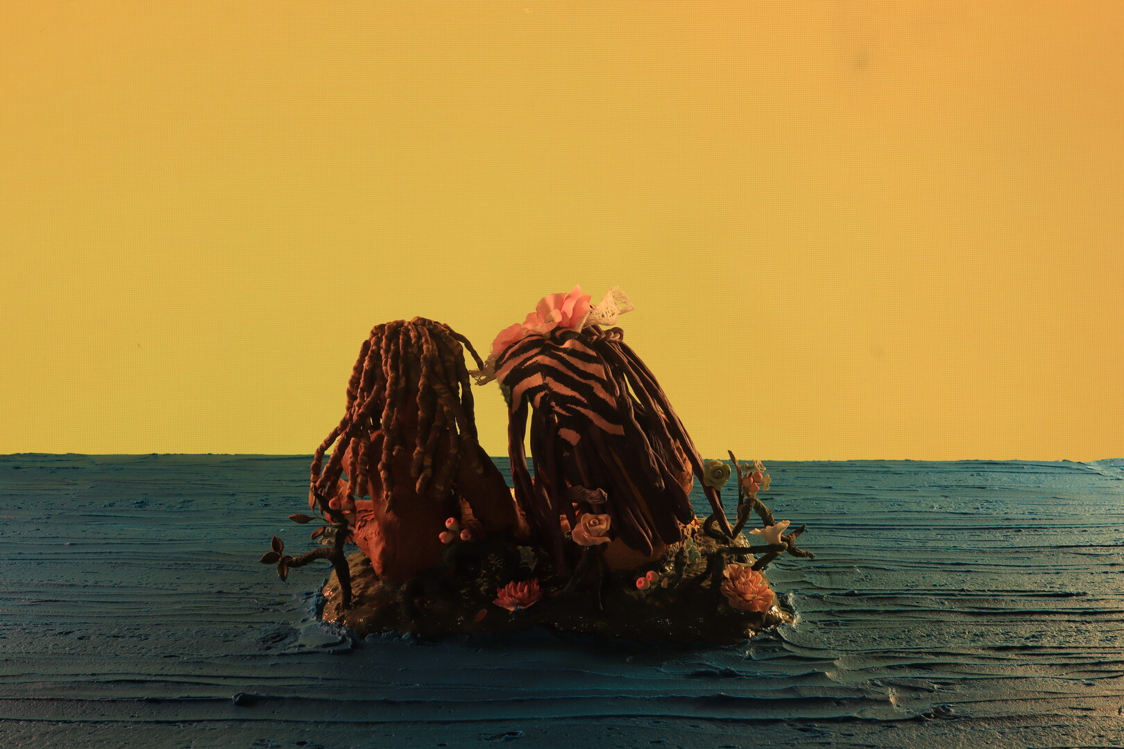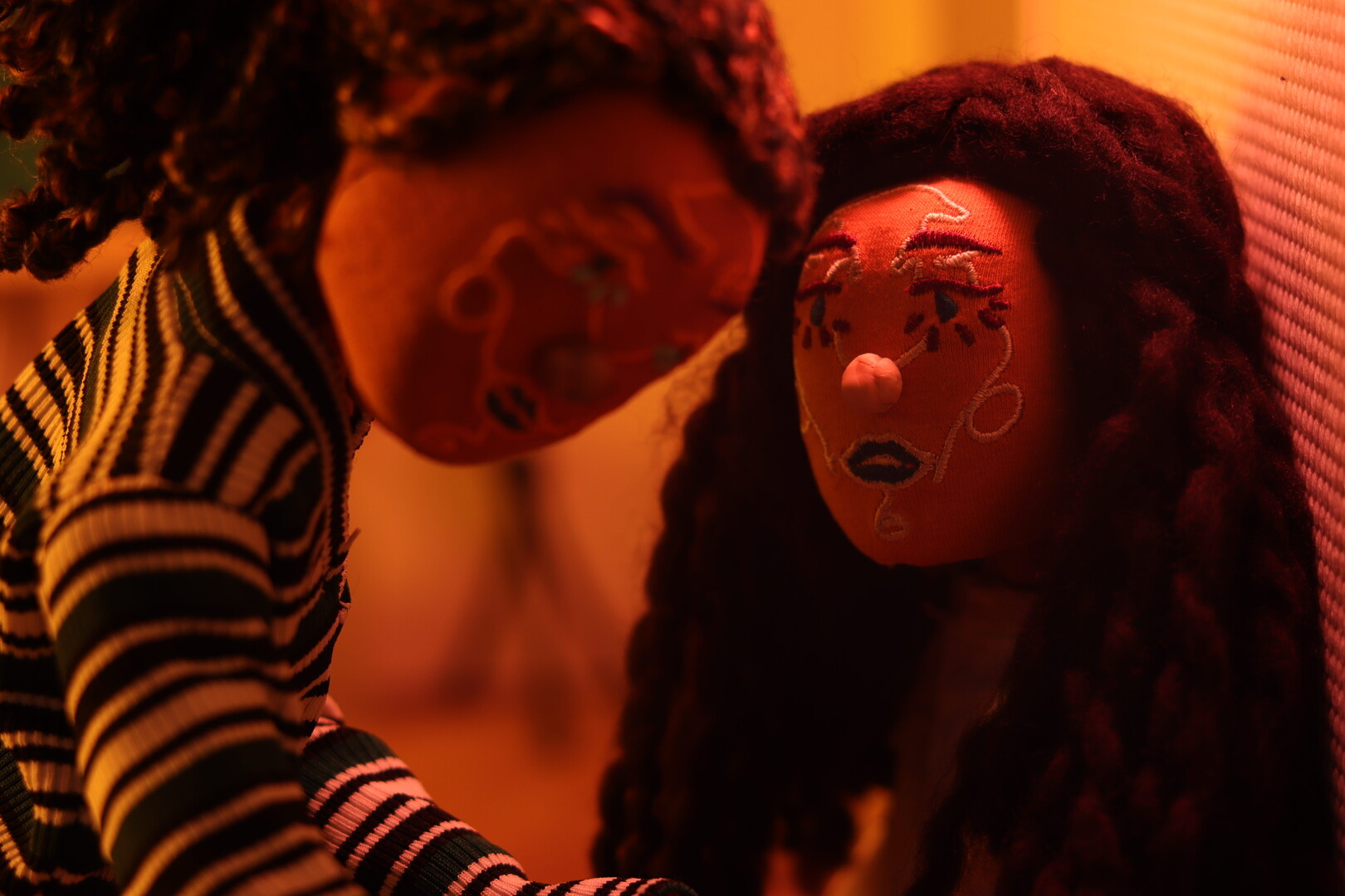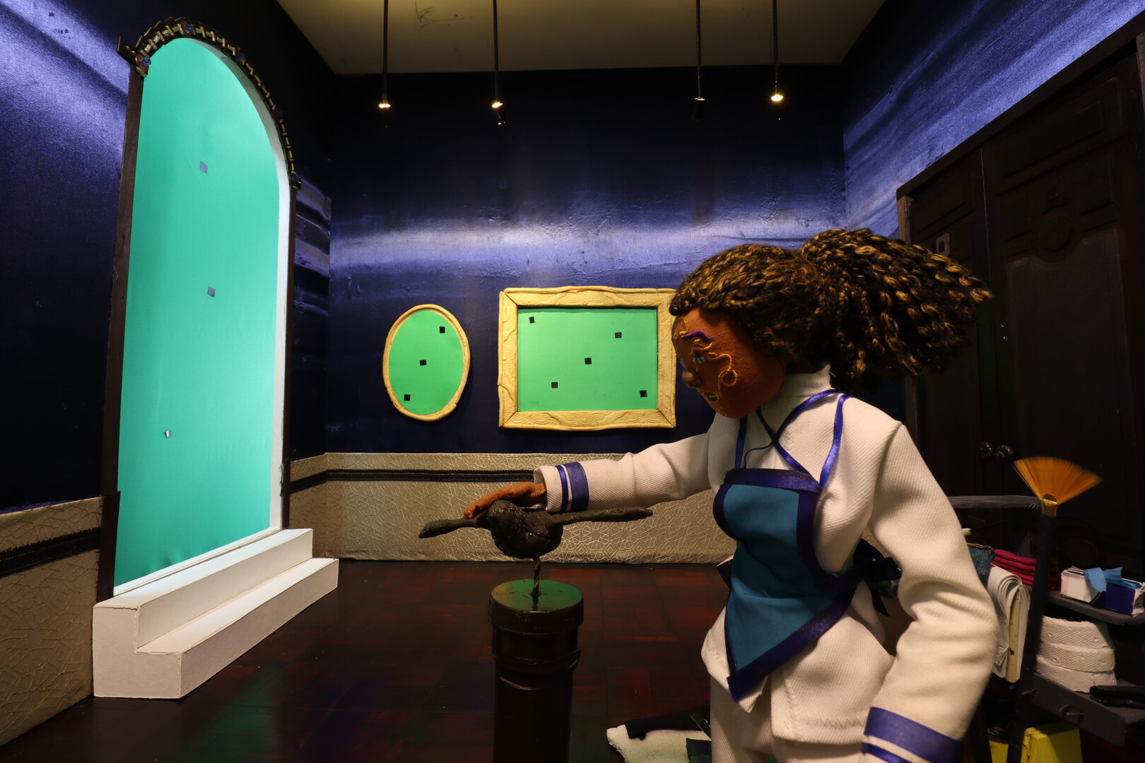 Las tonadas de un piano. El corazón latiendo. Entran los sonidos de todos los instrumentos. Un fondo de colores cálidos. Una banda de huesos aparece entre la tierra. Se erigen cimientos encima de la gente muerta. El exterminio. Una fosa común. Un museo, impuesto sobre los lugares donde yacen los antepasados. Cortometraje animado siguiendo los pasos silenciosos de Ilona, una muñeca de trapo, artista aficionada, trabajando miserablemente como conserje durante la exposición de pinturas “Héroes de la historia”, dedicada a las representaciones de las supuestas valentías de los próceres patrios. Una especie de Andy Warhol mujer es su jefa autoritaria. Subordina a la conserje más allá de sus labores al invisibilizarla: minimiza su existencia, la ve como un objeto que hace parte del museo. Lo que ella no conoce es el vínculo secreto entre las obras colgadas de las paredes con su empleada. Al apagarse las luces, es rutina compartir el cigarrillo con la calavera de Van Gogh, mostrarle una reproducción propia de sus colores, gestos, sombras, recibir sus observaciones, rascarle la nariz a la desesperada Venus de Milo y compartir miradas cómplices con otros personajes pintados o esculpidos: comienza el ritual de ensueño vivido a diario por la protagonista de botones como ojos y boca cosida con hilos. Los personajes construyen sus expresiones con gruñidos, quejidos, gemidos, pequeños sonidos que los hacen sentir orgánicos, capaces de escapar hacia el mundo cotidiano y abrazarse entre distintas dimensiones. Dicho enlace sensible permite a Ilona sentir el dolor de la esquina inferior del cuadro colgado como pieza central. Allí, una mujer, Gylda, es violada por un grupo de soldados en medio de un valle verde. Al ver su sufrimiento, sus ropas raídas, sus llantos enmudecidos por las bayonetas, comulga con ella y decide secuestrarla en su apartamento, curar sus heridas con un pincel, vivir un idilio entre la desnudez, el arroz, la tramontina, la pintura, el cuerpo transformándose y, así, compartir la intimidad entre ensueños. Amor en los tiempos de lo que sea que se llame el presente es una película detallista, muestra con dulzura las maneras que tienen las obras de arte para habitar dentro y fuera de nosotros. Aparecen en la mente otros films como Vienen las grietas o Malo pa’ pintar muñecos, donde la teoría museográfica es retada con detalladas formas cinematográficas y profundas reflexiones sobre el mundo del arte, los discursos superficiales y el statu quo de lo atroz. Cada fragmento en los salones, cuartos, profundidades de la tierra y demás espacios, fluyen en sus constantes movimientos y puntuaciones, aprovechando la técnica animada para generar sensaciones en cada parte del cuerpo.