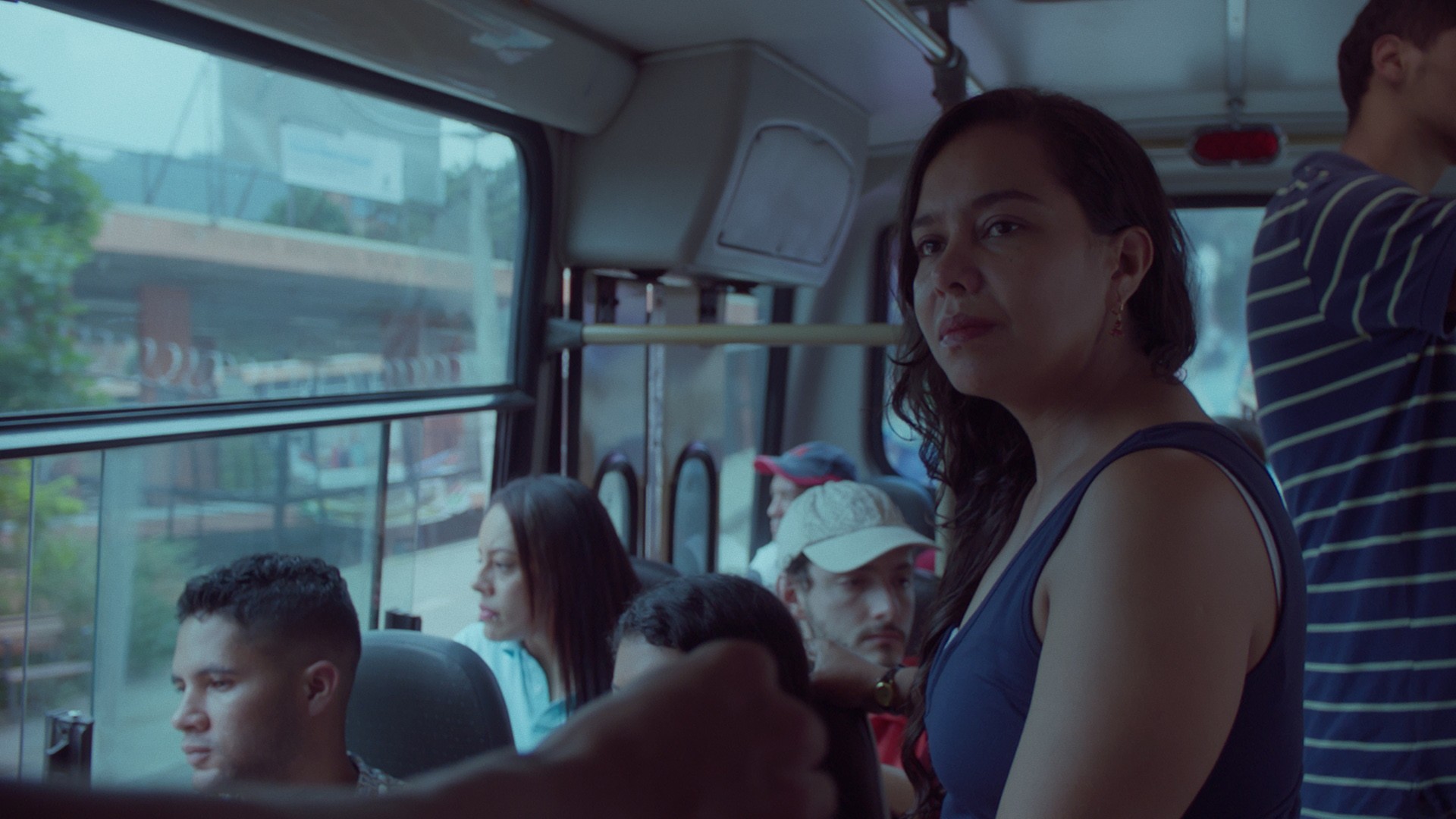 Aunque trabaja en seguridad, Sandra no se refugia de nada. Tampoco camina esperando que algo pase. Vive el mundo como puede. Que le pase lo que le pasa está lejos de ser un renacimiento o una curiosa sorpresa del destino. Es nada más que eso. Un pequeño encuentro, las cosas que pasan… Como la actividad que más veces hace Sandra es caminar, la película niega cualquier otro movimiento que no sea el de ir hacia adelante (y hacia adelante va Sandra o va la cámara). La atención proferida por el misterioso hombre que la invita a sentarse a su lado –modificando su panorama visual de ciudadana– la obliga con gusto (y siempre algo de temor) a reorganizar, de nuevo, su mundo, que es decir su rutina. Espacio y emoción, diferentes formas del origen de la atracción que la película empareja para referirse a la misma cosa: los retos emocionales de su protagonista. Como invitación a mirar, el estatus que alcanza lo rutinario supera lo central y lo cósmico. Comer salchipapas, comprar perfumes, viajar al lado del conductor de bus y ponerse (o quitarse) la ropa del trabajo son acciones que comparten la misma jerarquía. El seguimiento crónico a cierta homogeneidad en el ánimo de Sandra no se hace para azuzar el deseo de ver más y de ver furiosamente. Es justo lo contrario: la disposición de Yennifer Uribe tiende hacia la necesidad de ver más atentamente. El tema verdadero de La piel en primavera es la atención y los réditos de sostener la mirada. Un rostro no miente, un gesto tampoco. Que una buena parte de la película pase en un bus tiene que ver con eso. El viaje en bus motiva la concentración y la atención de la mirada (no por lo que pasa afuera del bus sino por lo que puede o no pasar entre los pasajeros y, más importante, el propio conductor). El transporte público es salvavidas para la curiosidad y la mirada atenta. Asimismo, diseñado casi que para el entrelazamiento, es donde con más frenesí crece la incomodidad de las miradas ajenas que persiguen o juzgan bajo la ley del arrebato y el deseo. La piel en primavera, de énfasis austero y mesurada excitación, sugiere que, incluso en una ciudad ruidosa, donde todo el mundo parece escuchar la misma música, puede nacer algo al menos parecido al amor. La última parte de la película se calibra para ver en un careo extremo la amplitud y la intensidad de ese “al menos”. Es descorazonador, sí, pero también, señal de los tiempos, acto cúlmen de cierta libertad y tranquilidad emocional. Es suficiente con el “al menos”. Después de todo, la película, consciente de que la naturaleza de la atracción es complicada, insiste en el dulce placer de la tranquilidad. De ver el mundo desde la casa. Entre otras cosas, es por eso que la película tiene el ritmo y la sensación de lo que pasa mientras uno se mira al espejo.